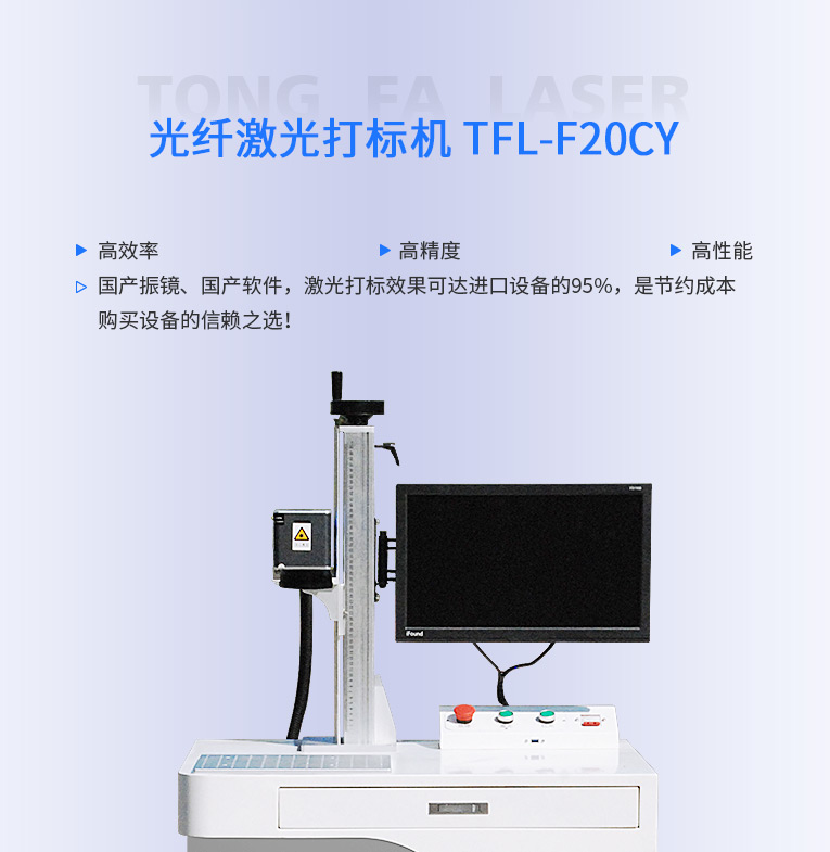 通發激光研發TFL-F20CY激光打標機,金屬材料和塑膠材料都進行打標加工,本激光鐳雕機配置成熟的20W和30W國產光纖激光器,國產振鏡、國產軟件,性價比高,激光打標效果可達進口設備的95%,是節約成本購買設備的信賴之選!