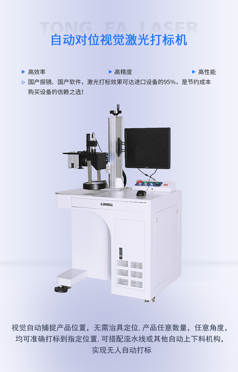 通發(fā)激光研發(fā)的自動(dòng)對(duì)位視覺激光打標(biāo)機(jī)TFL-F20CY-ZD,視覺自動(dòng)捕捉產(chǎn)品位置,無需治具定位,產(chǎn)品任意數(shù)量,任意角度,均可準(zhǔn)確打標(biāo)到指定位置,可搭配流水線或其他自動(dòng)上下料機(jī)構(gòu),節(jié)省人力,實(shí)現(xiàn)無人自動(dòng)打標(biāo),可搭配流水線或其他自動(dòng)上下料機(jī)構(gòu),節(jié)省人力,實(shí)現(xiàn)無人自動(dòng)打標(biāo),極高的重復(fù)頻率,打標(biāo)速度快;極高的光學(xué)質(zhì)量,實(shí)現(xiàn)精細(xì)打標(biāo),可與光纖、CO2、半導(dǎo)體等各種波長(zhǎng)的激光光路集成.
