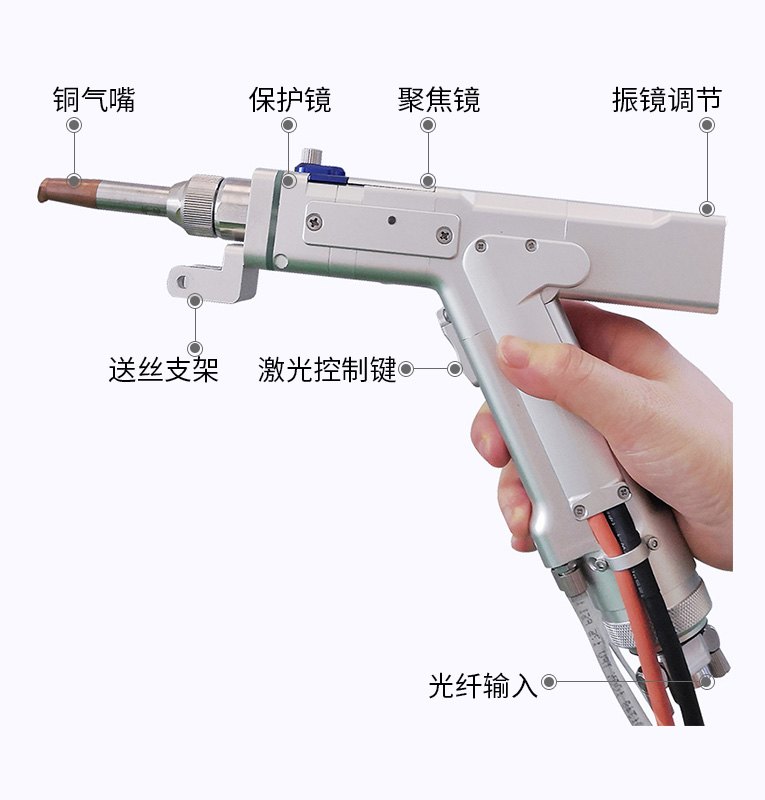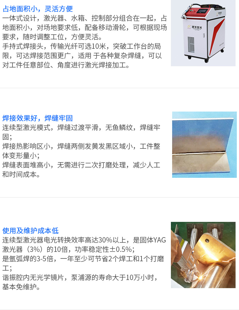 通發激光一體式手持式激光焊接機,用手持式焊接槍替代以前固定光路,手拿焊接,靈活方便,焊接距離更長,克服工作臺空間的局限性,工件尺寸不統一時無法自動焊接的情況下使用。主要針對大型工件、固定位置如內直角、外直角、平面焊縫焊接、焊接時熱影響區域小,變形小、而且焊接深度大,焊接牢固。是遠距離焊接大工件的較為靈活的全新的焊接工藝。